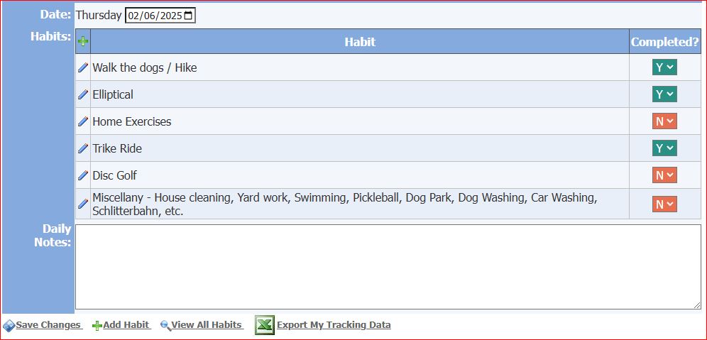 My Habits Tracker is free to anyone who would like to track their habits for motivation in improving their lives. You can see your progress on charts to see how you are doing. If you ever want to cancel your membership, you can export all your tracking data to an Excel spreadsheet. If you are already a registered user, please LOG IN HERE, or if you would like to create an account you can JOIN HERE.